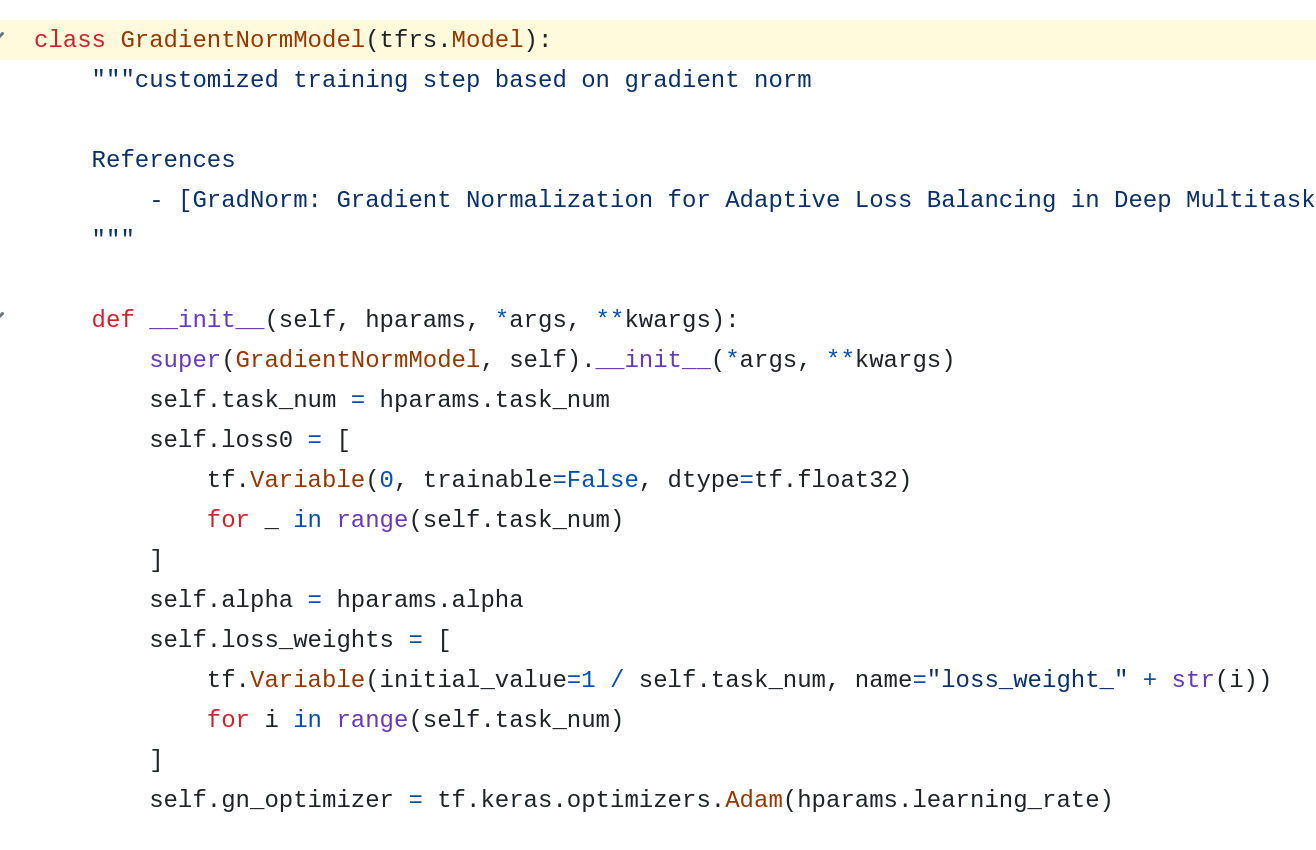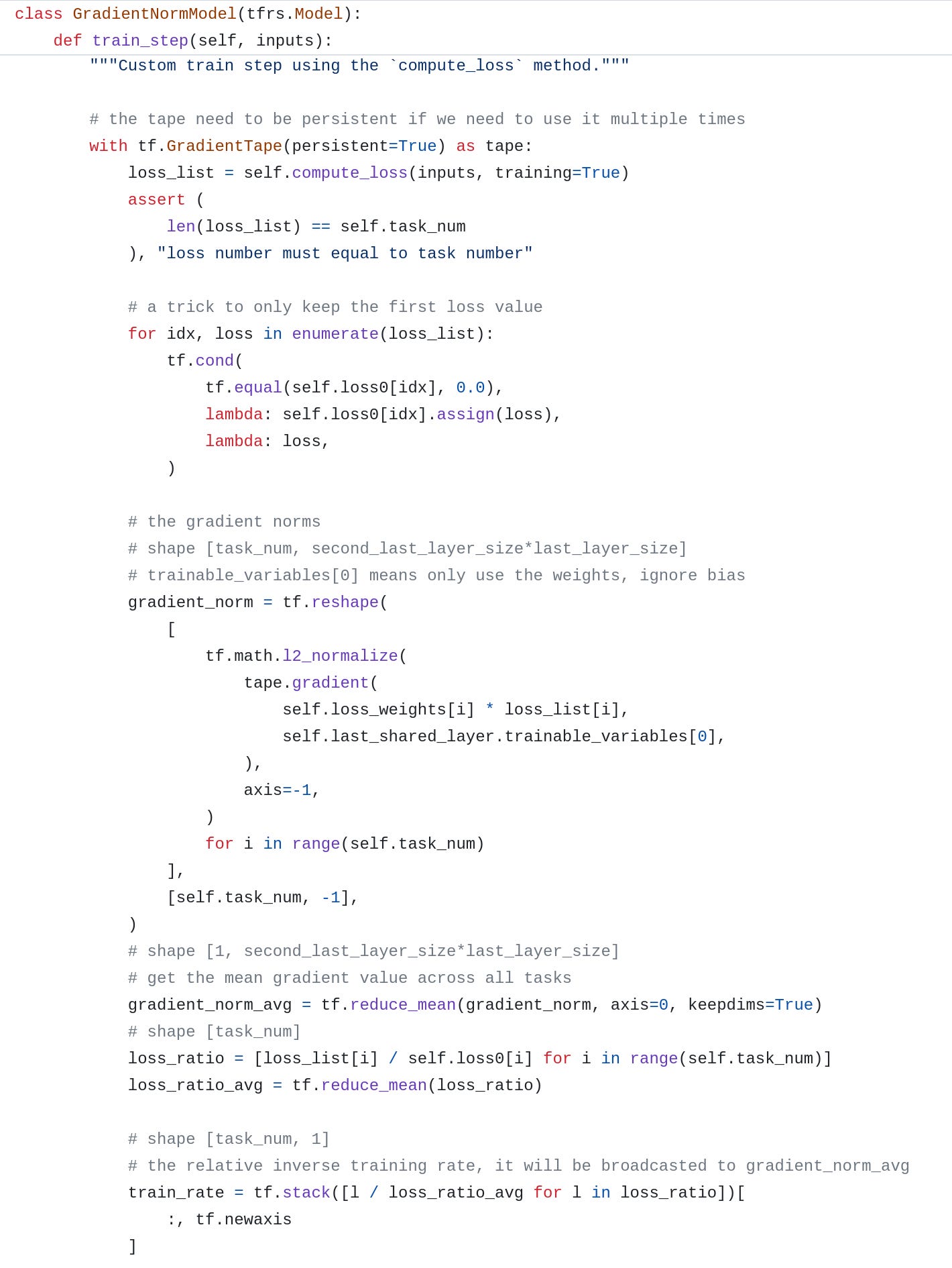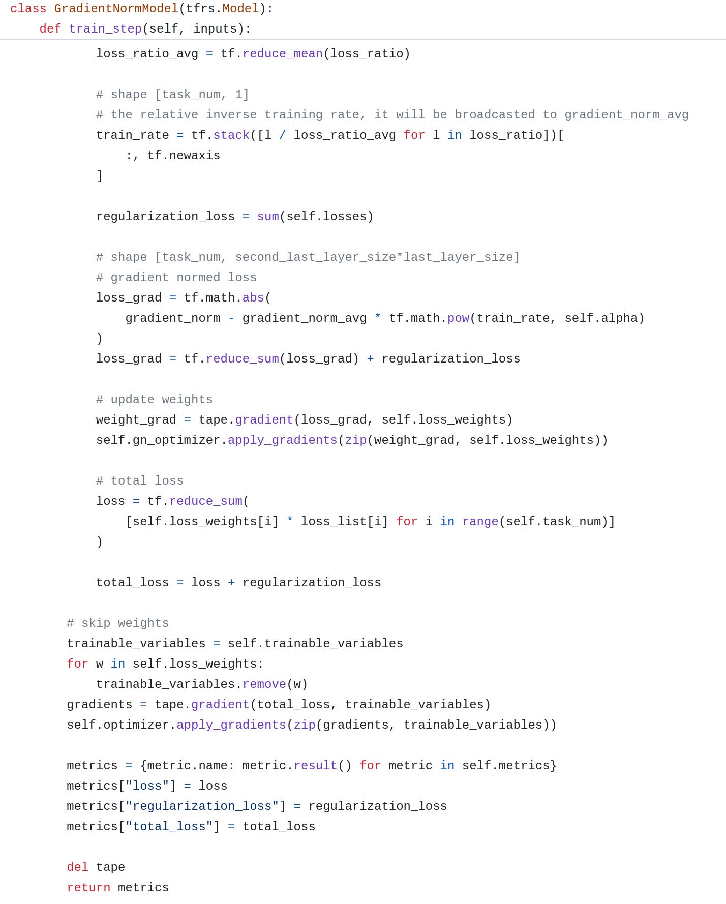 Implement GradNorm in TensorFlow is a bit complicated. I tried my best to make it clear. I didn’t find any implementation for TensorFlow 2 yet, and I hope this can help us in our daily work.