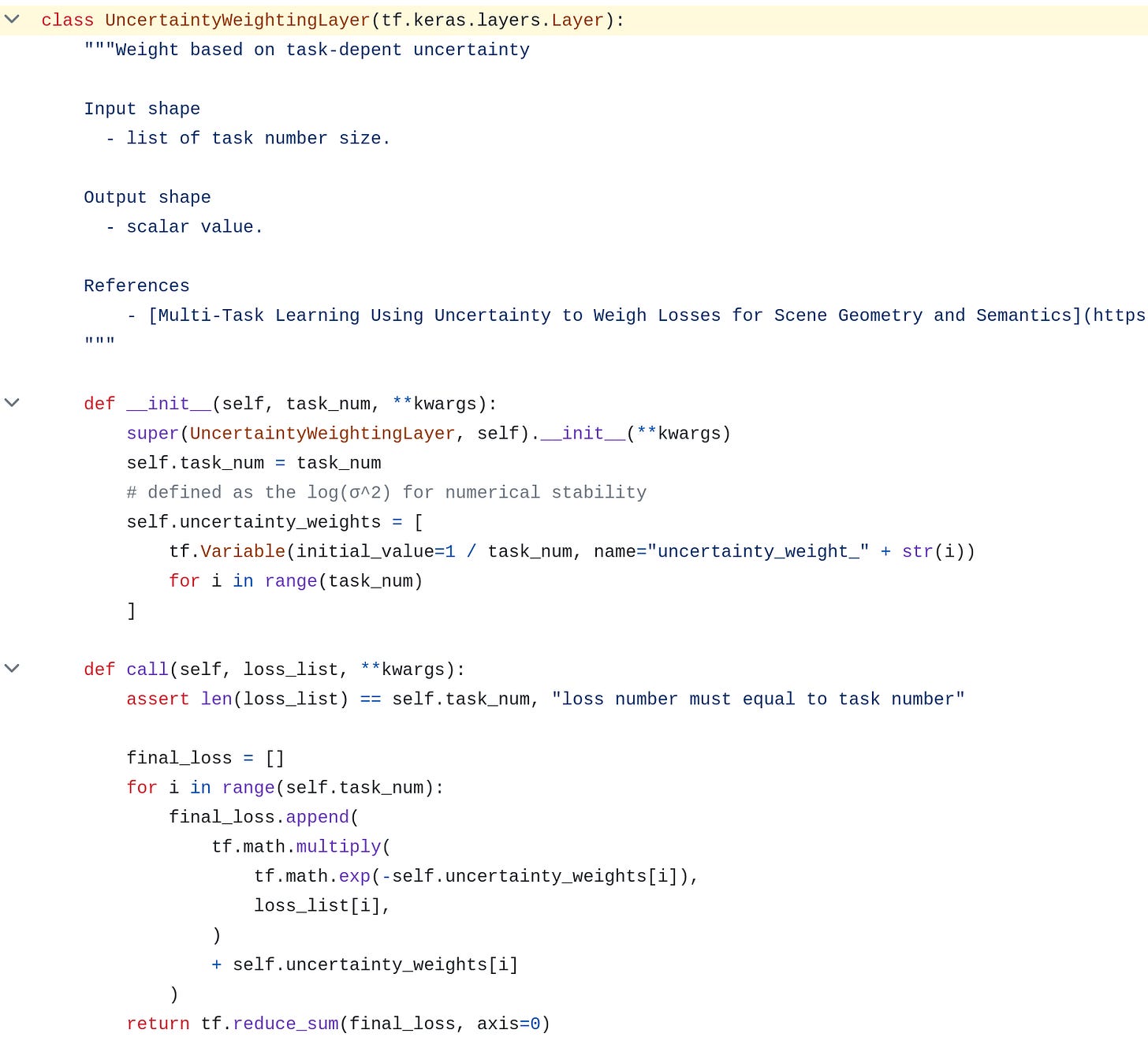 The implementation is straightforward. We just need to define the two σ as the trainable weights. Notice that there is a trick, instead of directly learn the σ in the equation. We take the trainable variable as the log variance log(σ^2) and use exponential operation to map it back for numerical stability. This can avoids any division by zero.